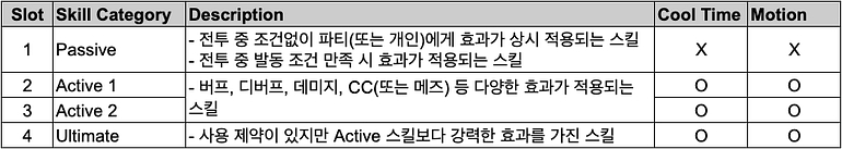 스킬은 패시브(Passive), 액티브(Active), 궁극기(Ultimate) 유형으로 나뉘며, 각각 N, R, SR 등급으로 세분화됩니다.